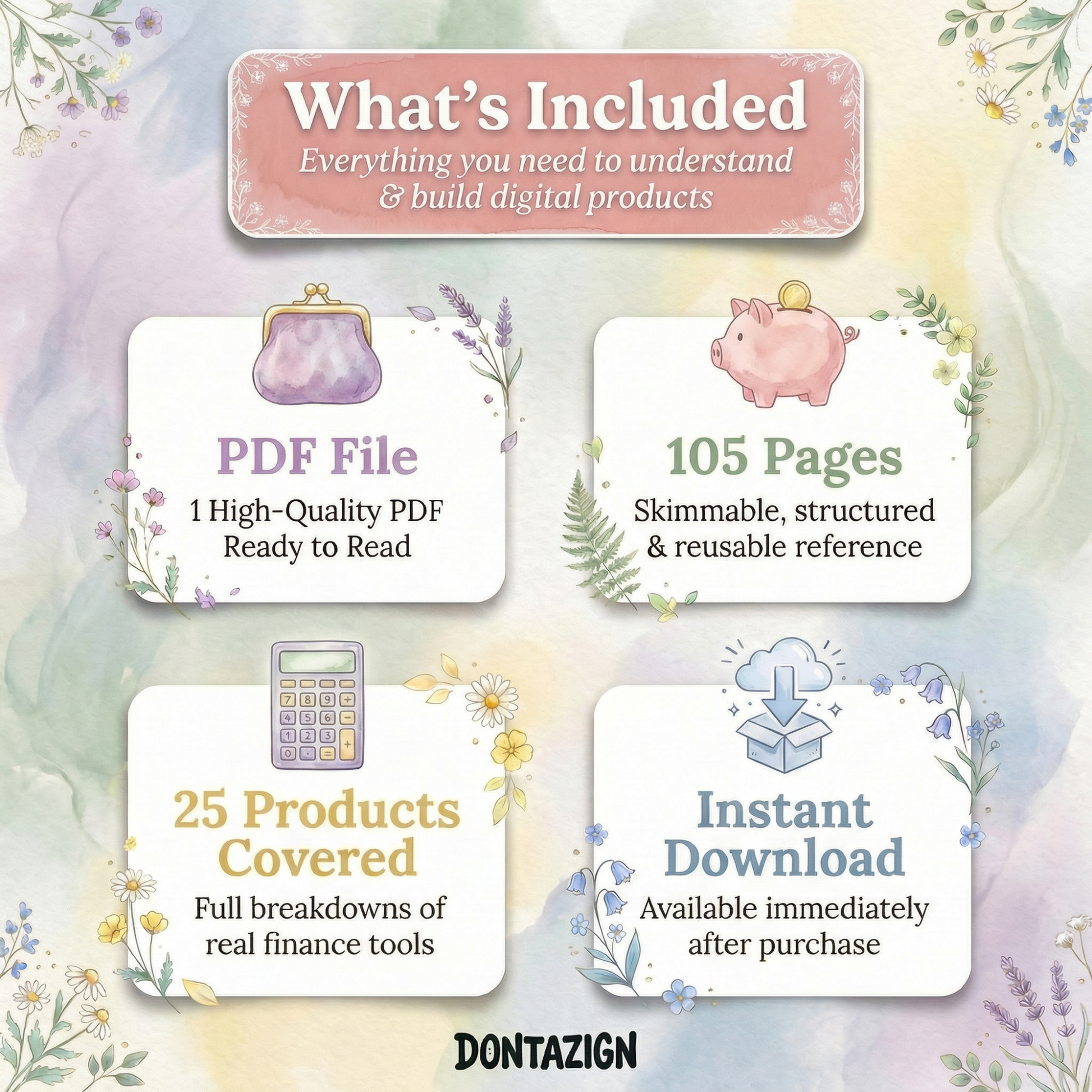 Inside this 105-page system, you’ll learn how to build 25 finance-focused digital products across 3 core financial categories — each broken down to its exact structure, layout, and purpose.